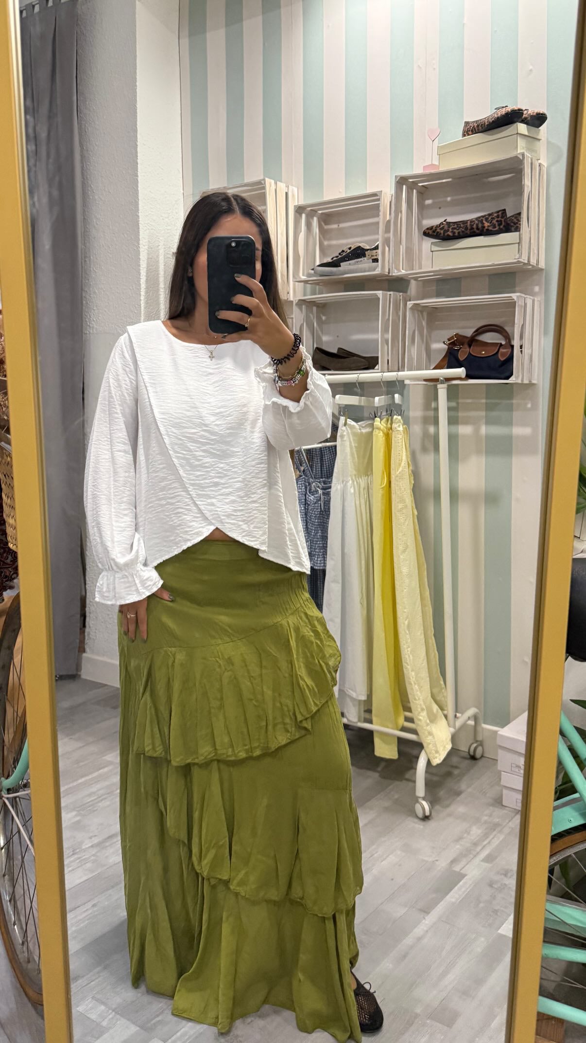 Falda disponible en talla única, con goma en la cintura se adapta desde una talla 34 a una 40.